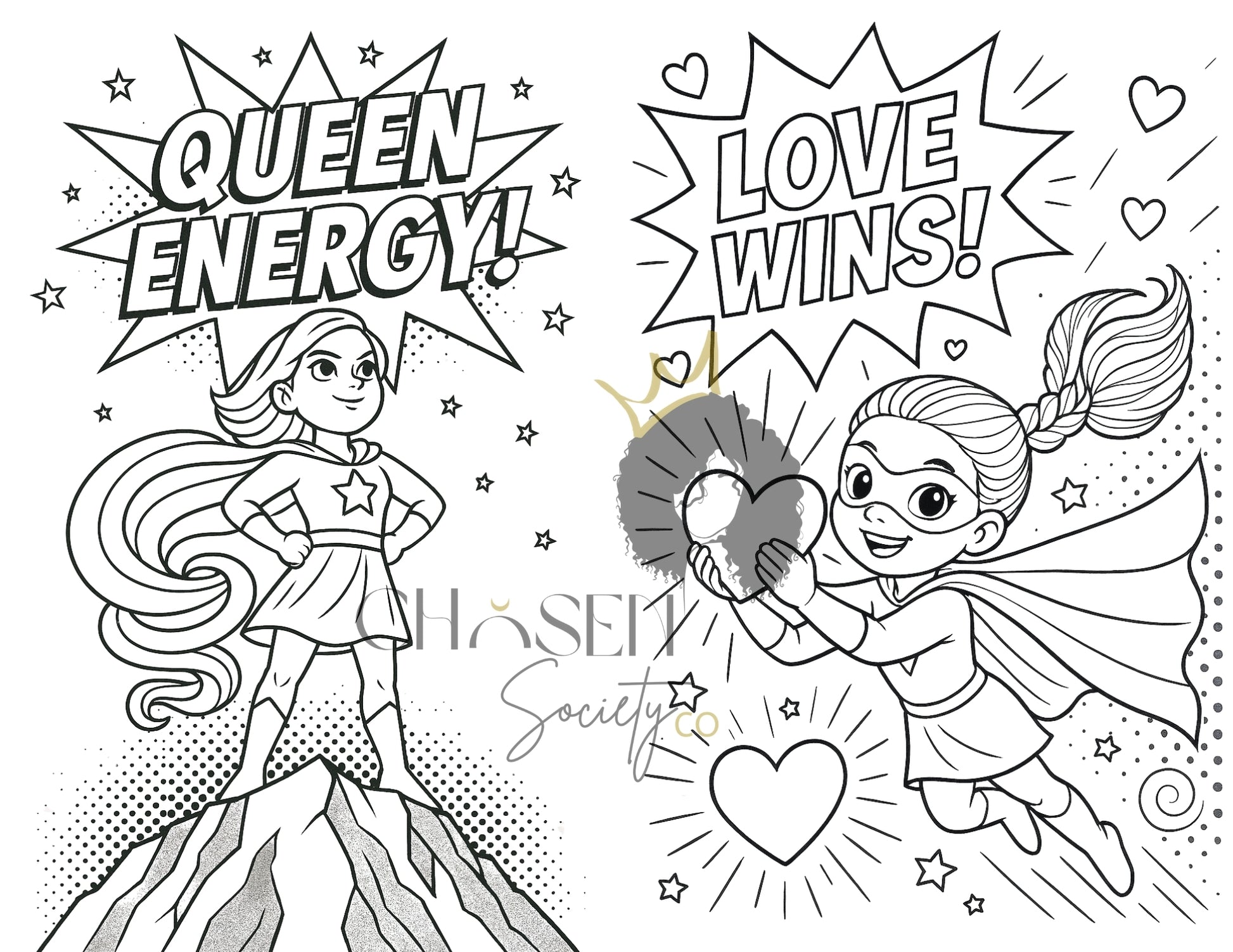 Every page is packed with bold, comic-style superhero girls, uplifting affirmations, and vibrant Pop Art designs that inspire kids to dream big, shine bright, and believe in themselves.