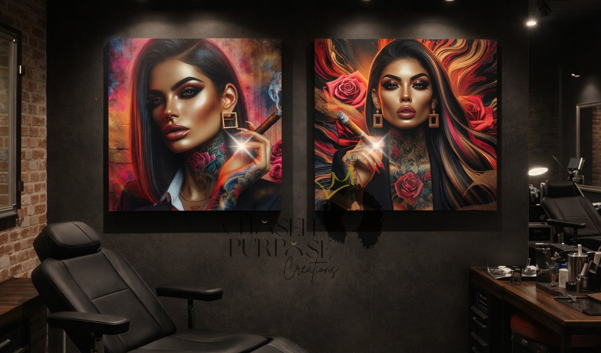 Featuring a striking woman surrounded by dramatic roses, rich color, and editorial-style lighting, this artwork commands attention and emotion. It is created for women who lead with intention, brands that stand boldly in their identity, and spaces that reflect power without apology.