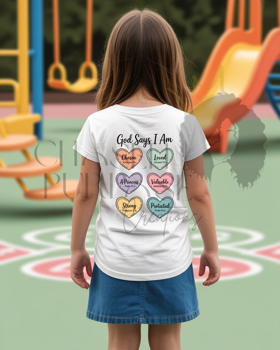- God Says I Am Heart Badges (Chosen, Loved, A Princess, Valuable, Strong, Protected)